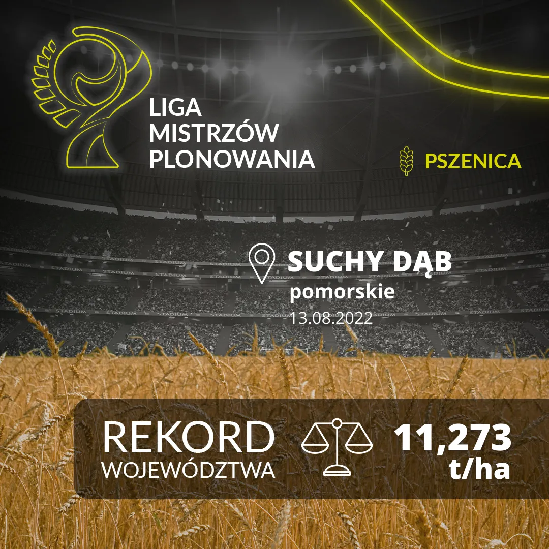 Pan Adrian Kałkus uczestnik Ligi z miejscowości Olszowiec w sobotę 30 lipca 2022 roku żniwował na odmianie pszenicy RGT RITTER i zebranym plonem 10,173 t/ha ustanowił w ramach Ligi Mistrzów Plonowania Rekord Województwa Lubelskiego w klasie NAJWIĘKSZY PLON PSZENICY OZIMEJ Z HEKTARA UZYSKANY W 2022 ROKU